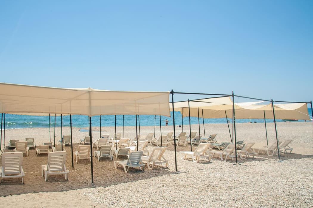 Tesisin 150 metre uzunluğunda kum ve çakıl halk kısmında özel plajı bulunmaktadır.